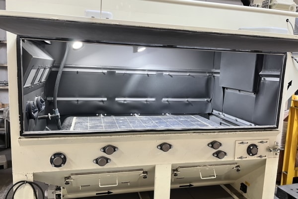 リサイクル部では、後耐用年数を過ぎた太陽光パネルが大量に発生することを見据え、使用済みの太陽光パネルを解体・リサイクル処理する設備を導入しております。